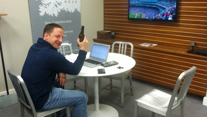 Dana finding that all important work/life/beer balance. Broder 15 Broad St office c. 2012