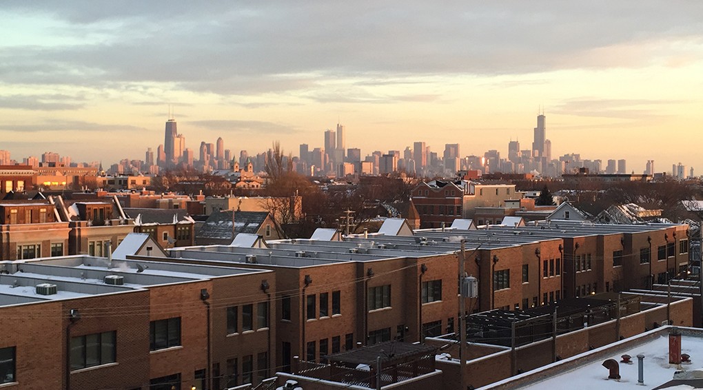 Beautiful Chicago skyline view from the top of the Tag Outlet. Chicago IL c. 2016